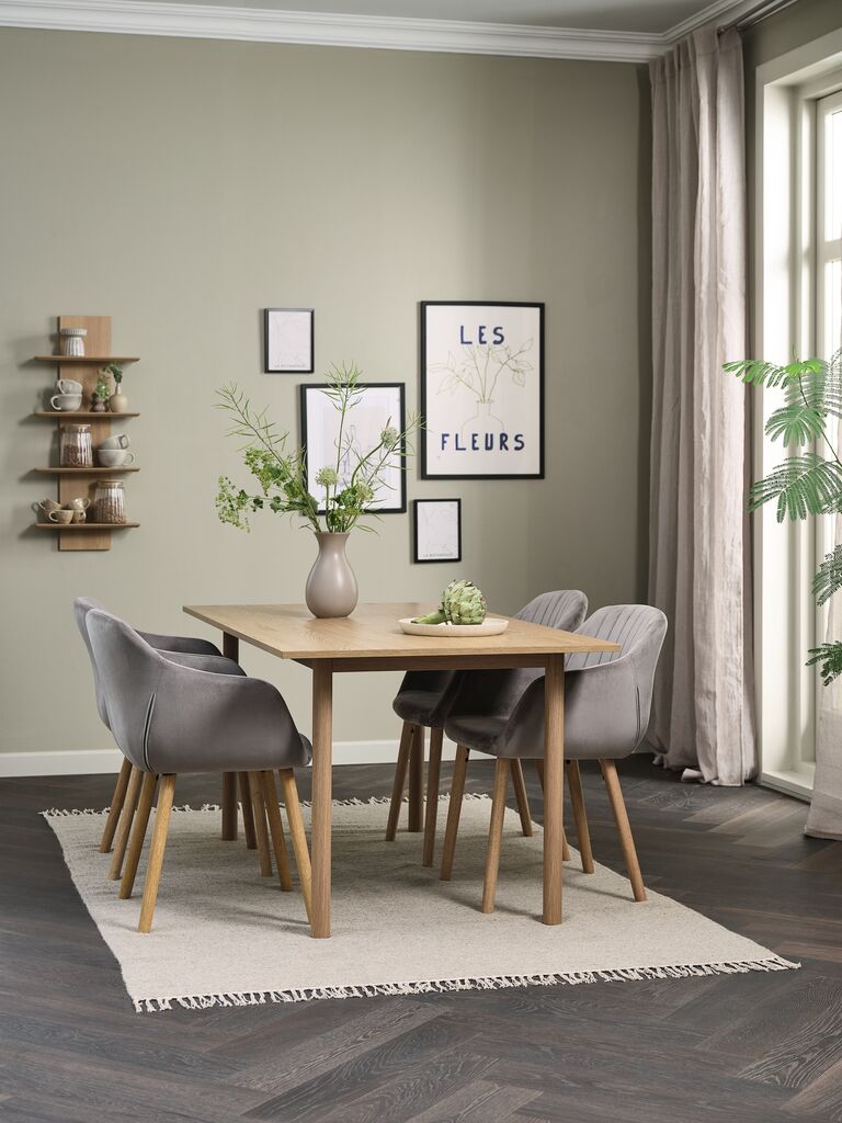 ALSTED + ADSLEVALSTED D160 stôl prírodný dub + 4 ADSLEV sivá zamat