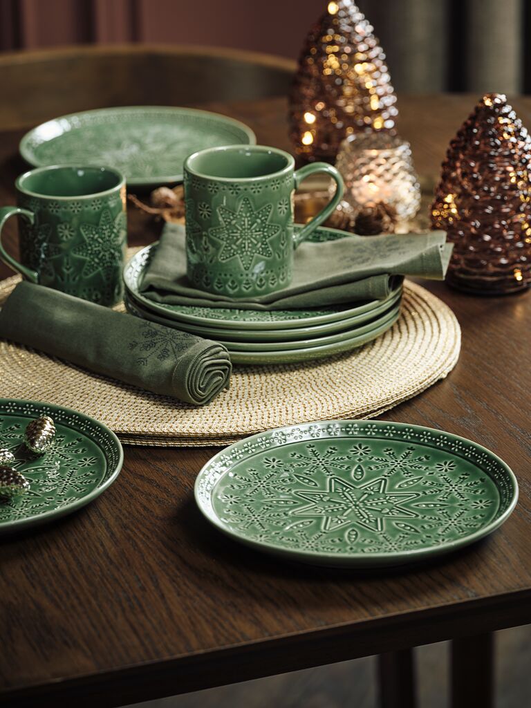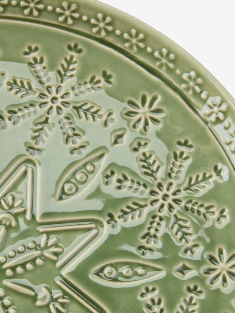 Zelený tanier z lesklého porcelánu s rustikálnym dizajnom a vianočným vzorom. Použite ho na vianočnom stole pri podávaní dezertu alebo predjedla. Ø20 x V2 cm