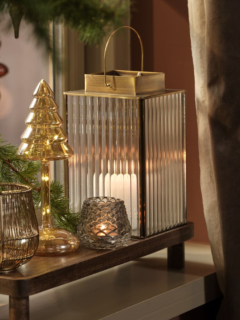 Krásny lampáš s hrubými vlnitými sklami. Zmestí sa doň 20 cm sviečka. Ked svieti,vyzerá luxusne :)