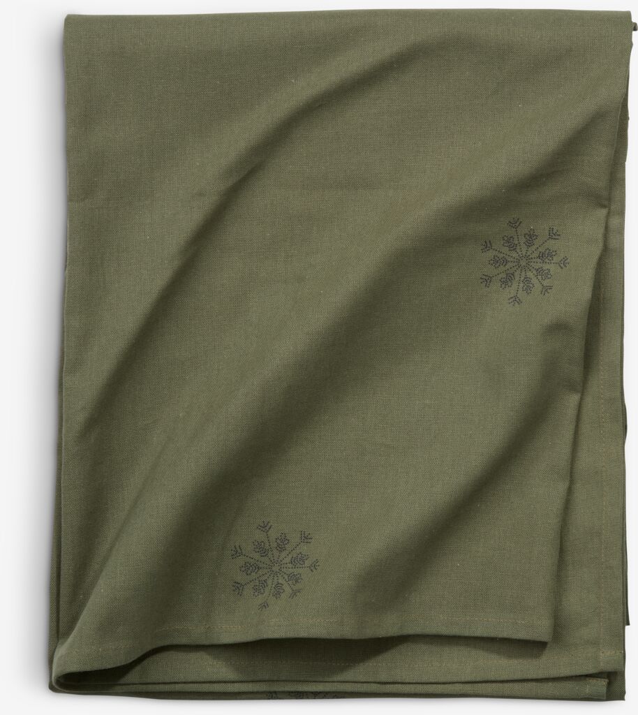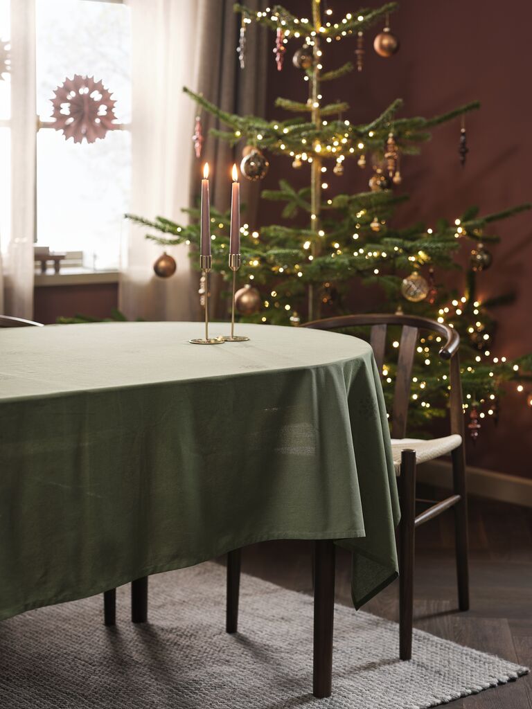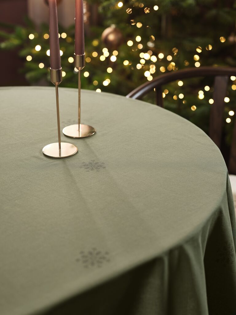 Obrus vyrobený zo 100 % bavlny. Jeho zelená farba a jemný vzor snehových vločiek vytvorí teplú a príjemnú atmosféru na vašom vianočnom jedálenskom stole. 140x240 cm