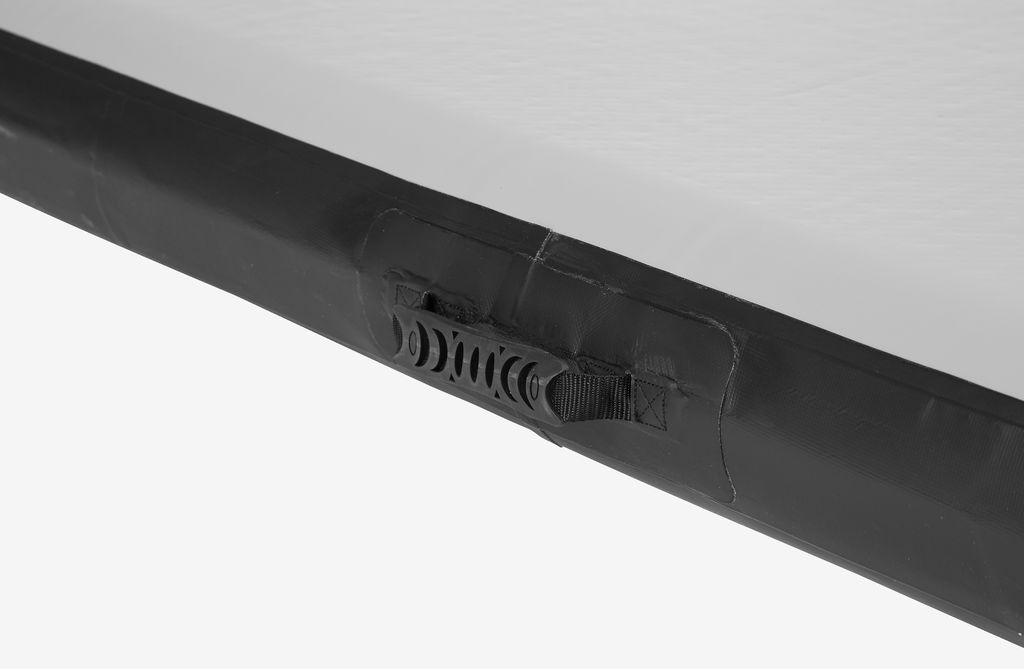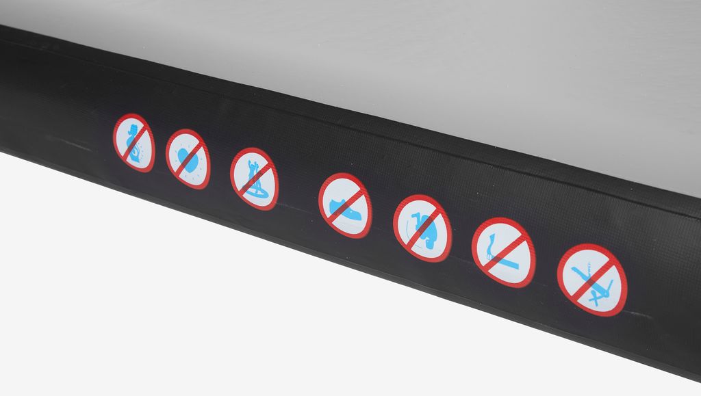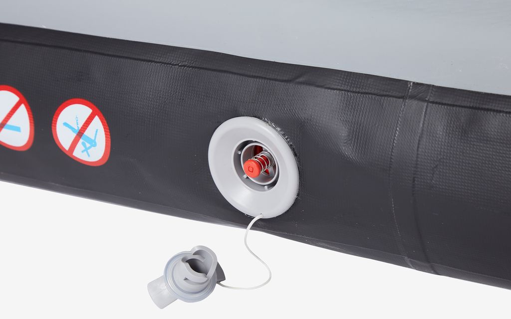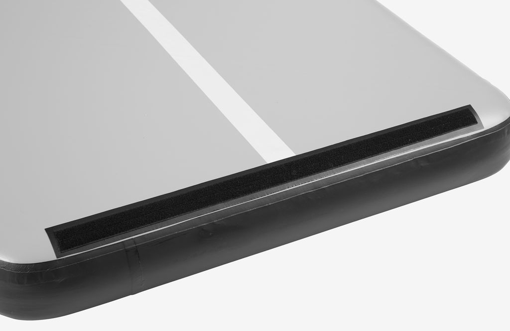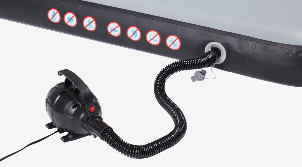 Plast. Tvarovaný, dvojvrstvový obal a vnútorná konštrukcia so 16 000 stabilizačnými závitmi. Samozatvárací ventil. Je možné pripojiť dve alebo viac gymnastických podložiek. Max. nosnosť 120 kg. Vrátane elektrickej pumpy a tašky. Š100 x D450 x V15 cm