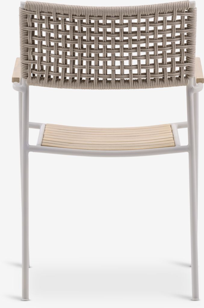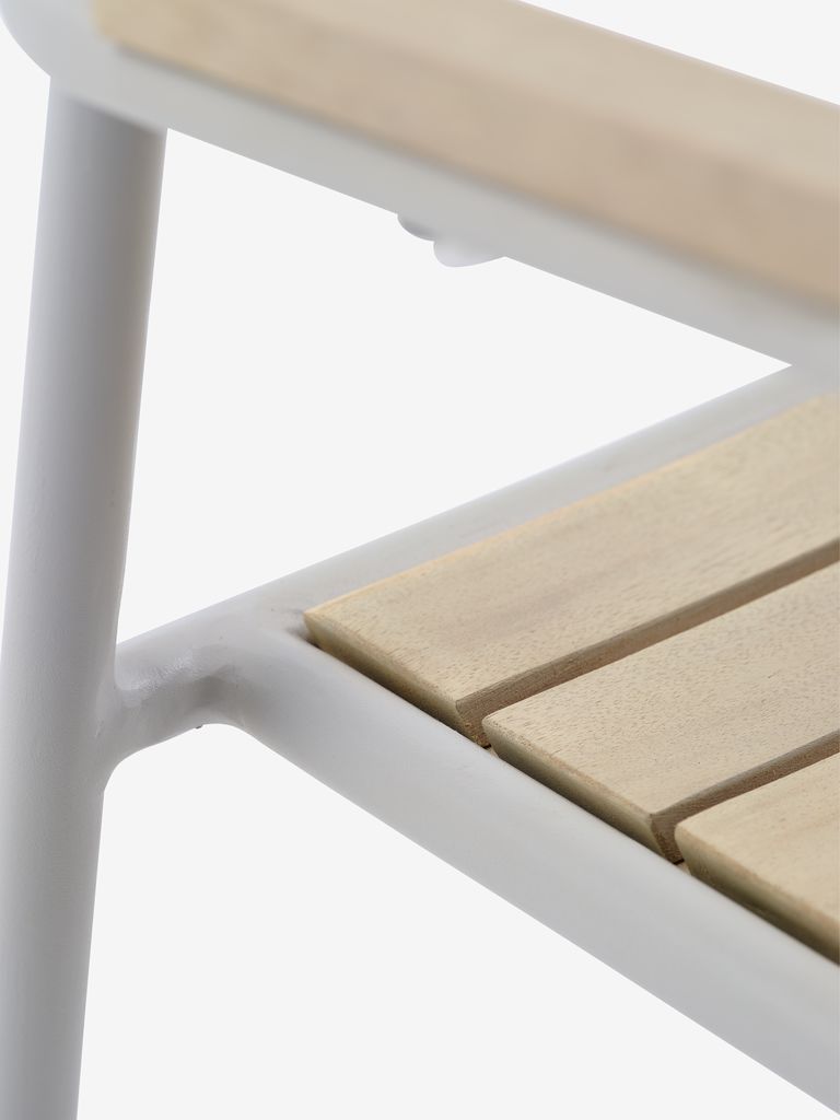 4-miestna záhradná zostava. Stôl: Hliník a kompozitné drevo DURAWOOD®. DURAWOOD® je odolný kompozitný materiál skladajúci sa z vlákien FSC® tvrdého dreva a plastu. Š100 x D215 x V75 cm. Stolička: Galvanizovaná oceľ, polypropylén a olejované FSC® tvrdé drevo. Stohovateľná.