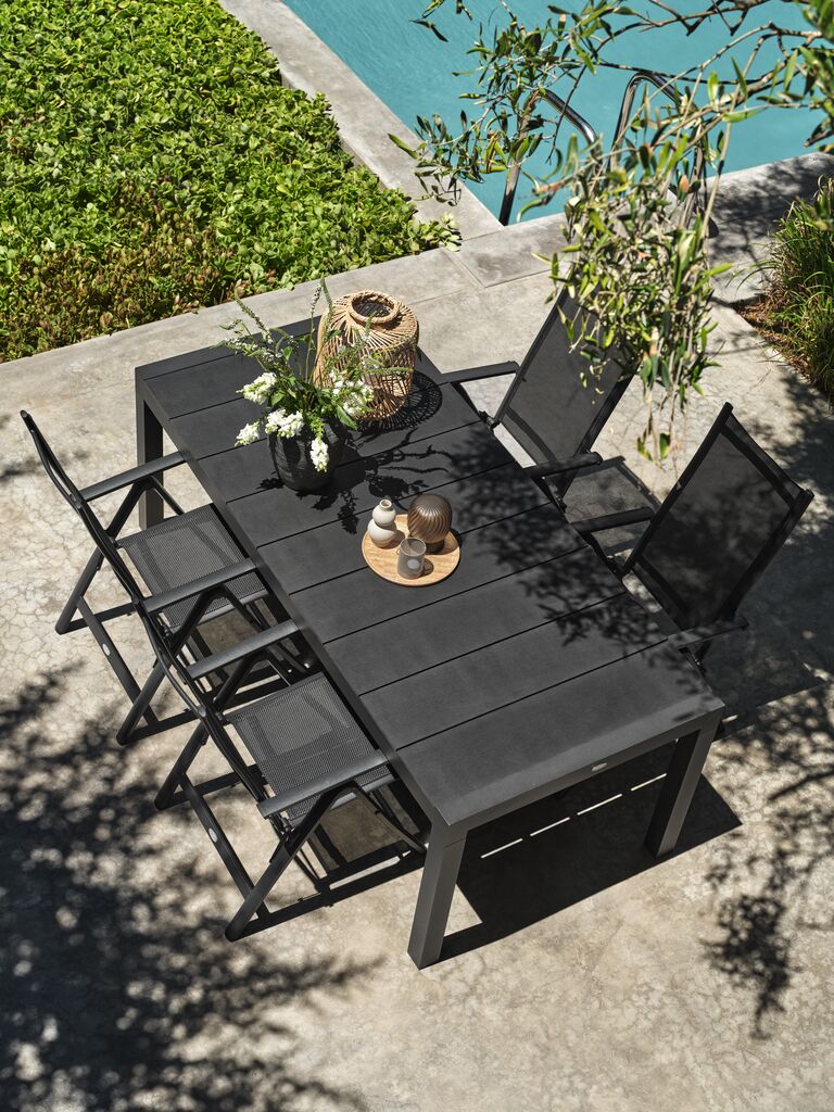 4-miestna kaviarenská zostava. Stôl: Hliník a umelé drevo. Vrátane 1 prídavnej dosky, ktorá sa dá uložiť pod dosku stola. Š95 x D208/272 x V76 cm. Kreslo: Hliník a textilén. 6 polôh. Skladacie.